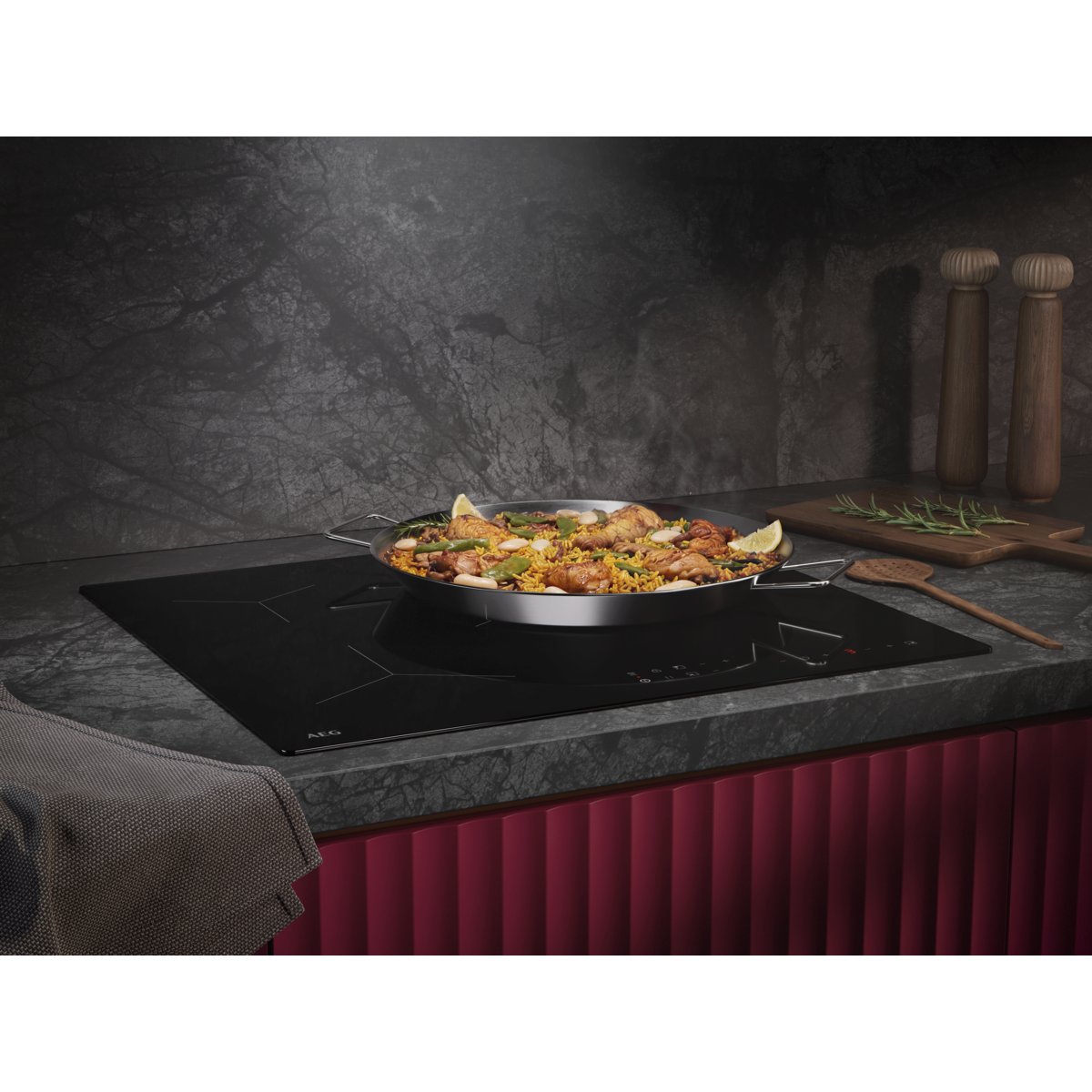 Placa de inducción Serie 5000 Induction de 60 cm de 3 zonas (32 cm, 18 cm y 14,5 cm), zona Paella (32 cm), Controles individuales con temporizador individual (Potencias de 0 a 9 con 3 zonas PowerBoost), función Pausa, bloqueo de seguridad, conexión Hob2Hood con una campana compatible, sin marco