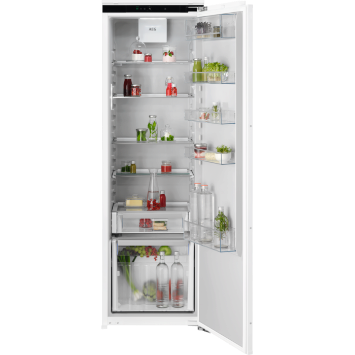 Frigorífico de 1 puerta integrable de la Serie 6000 Dynamic Air, 1,77 m x 55,7 cm, Dynamic Air + Ventilador, display digital con Ecometer, cajón Maxibox + Extrazone, instalación puerta sobre puerta, filtro antiolores, luces LED de intensidad regulable, estantes FlexiShelf. interiores fabricados con material reciclado. cierre suave de la puerta, posible instalación en conjunto con NAB7N181DC