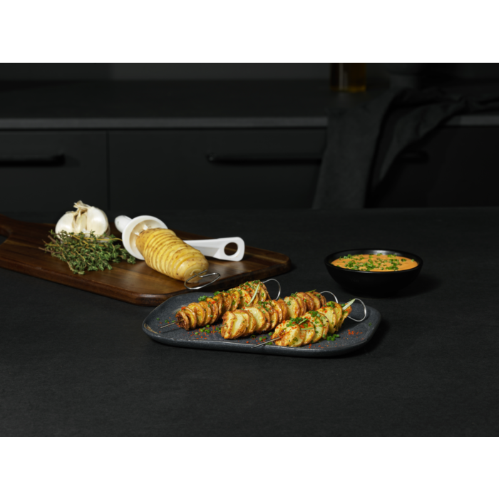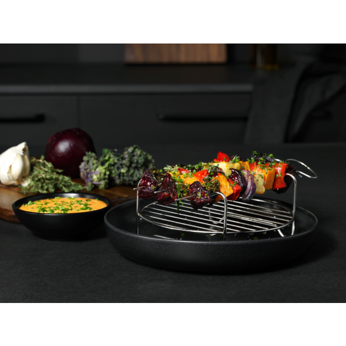 Kkit para las freidoras de aire compuesto por: 1 molde para hornear, 1 rejilla, 4 pinchos y 1 espiralizador para verduras. Accesorios útiles para facilitar el horneado, la parrilla, el asado y conseguir alimentos crujientes, sin tener que comprar cada accesorio por separado