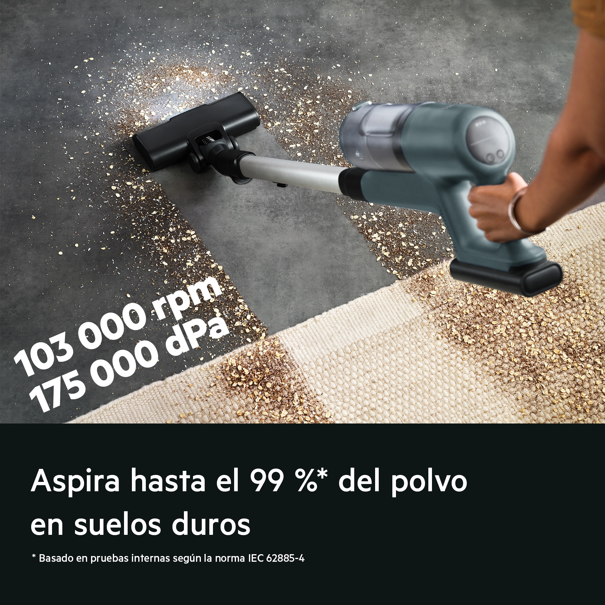 Medido frente a la anterior aspiradora sin cable 600 con depósito de polvo cargado con polvo DMT (prueba estándar), según IEC 62885-4