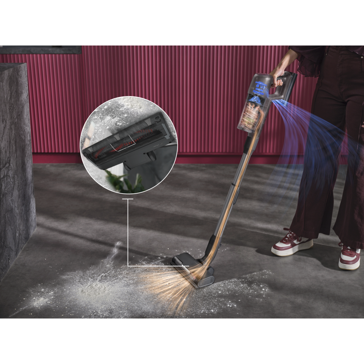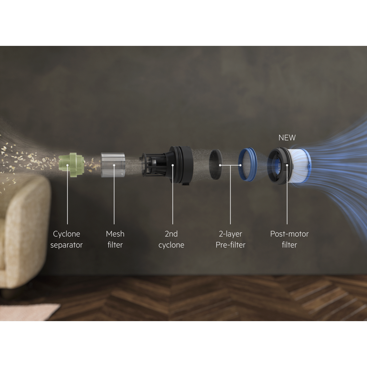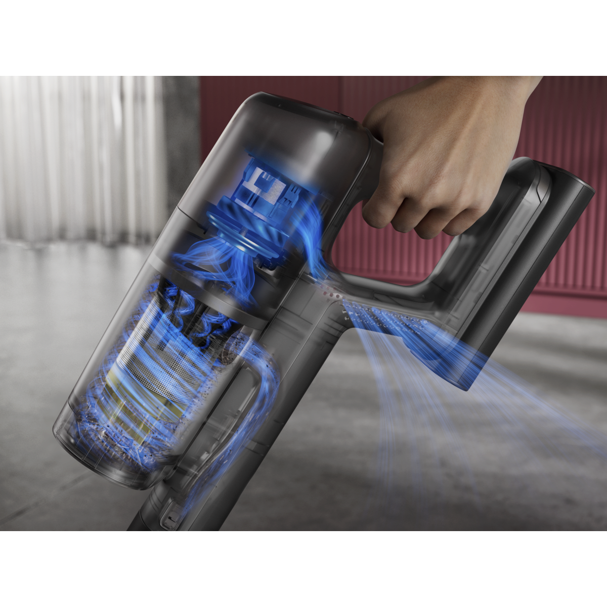 * En comparación con el motor de ciclón simple de las aspiradoras sin cable.** Basado en pruebas internas según la norma IEC 62885-4.