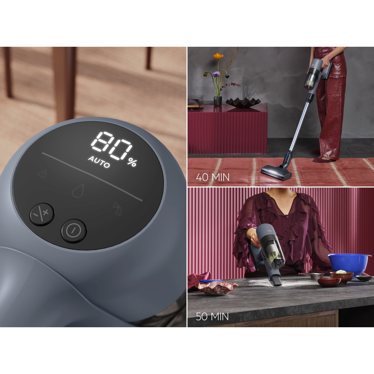 * Basado en pruebas internas según la norma IEC 62885-4 de tiempo de funcionamiento de la unidad manual y la aspiradora completa en modo Mín. ** En comparación con el modo Boost. *** Cobertura de limpieza basada en pruebas internas con doble pasada en cada zona a una velocidad de 0,5 m/s.
