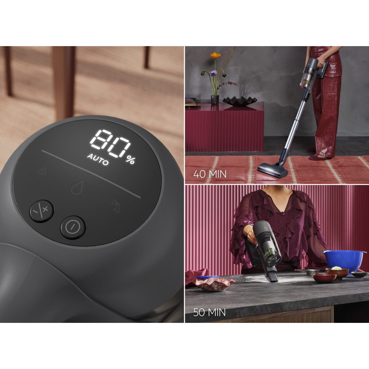* Basado en pruebas internas según la norma IEC 62885-4 de tiempo de funcionamiento de la unidad manual y la aspiradora completa en modo Mín. ** En comparación con el modo Boost. *** Cobertura de limpieza basada en pruebas internas con doble pasada en cada zona a una velocidad de 0,5 m/s.
