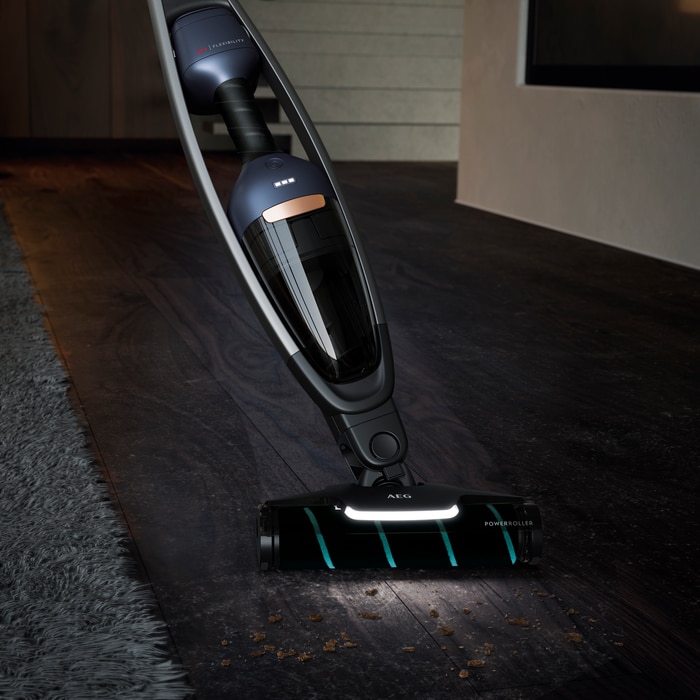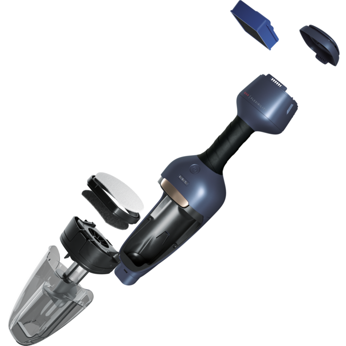 Aspiradora sin cable 2 en 1 con batería de litio de alta densidad (2100 mAh), doble sistema de filtrado, 53 minutos de autonomía, cepillo PowerRoller, parking vertical, 25,5 V, azul índigo. Accesorios incluidos: suplemento extensor de alcance para espacios estrechos