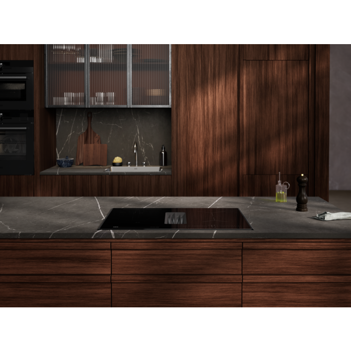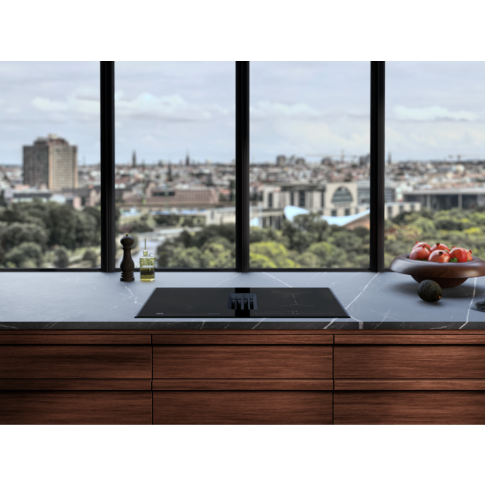Placa de inducción de 68 cm con campana extractora integrada de la Serie 6000 Bridge, función Puente, controles deslizantes (0-9 con función Power) individuales con temporizador Eco individual, campana con 3 velocidades + 1 intensiva y modo Auto, (650 m³/h), filtro de carbón activo y de grasas con indicador de saturación, instalacción en modo recirculación con opción en modo extracción al exterior con accesorios adicionales