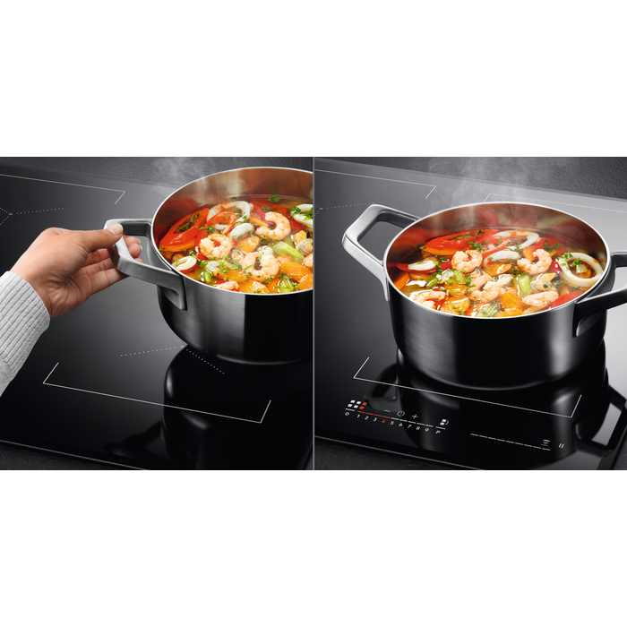 Placa de inducción de la Serie 6000 TotalFlex ActiveTouch biselada extraplana de 60 cm con 4 zonas de cocción de inducción total con detección de recipientes de hasta 35 cm, controles intuitivos con reconocimiento de zona automático, función Puente, sistema Hob2Hood, panel táctil deslizante con potencia de 0 a 9, bloqueo de seguridad y función PowerBoost, temporizador y función Pausa