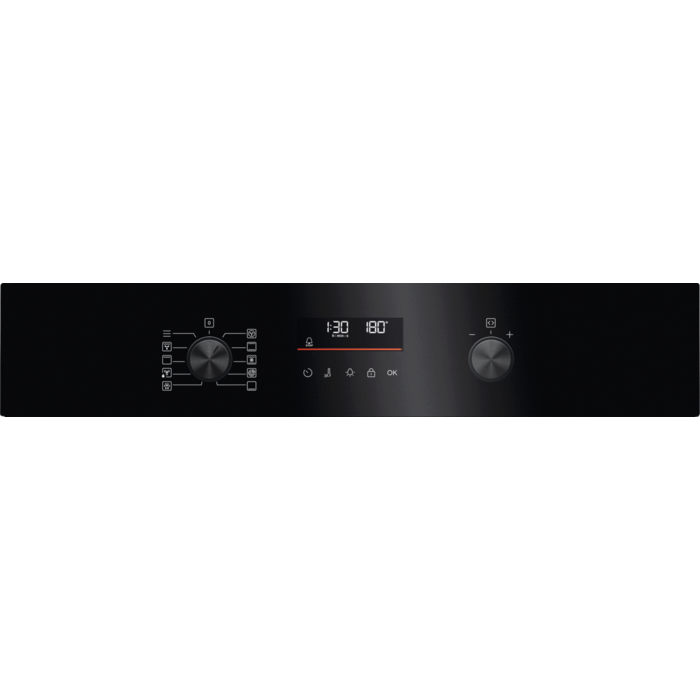 Horno pirolítico multifunción de la Serie 5000 SurroundCook y Display LED Explore, de 72 litros, 9 funciones y 45 programas automáticos, mandos escamoteables Inox, puerta de 3 cristales, cristal negro con perfil Inox Infinity y tirador negro anodizado