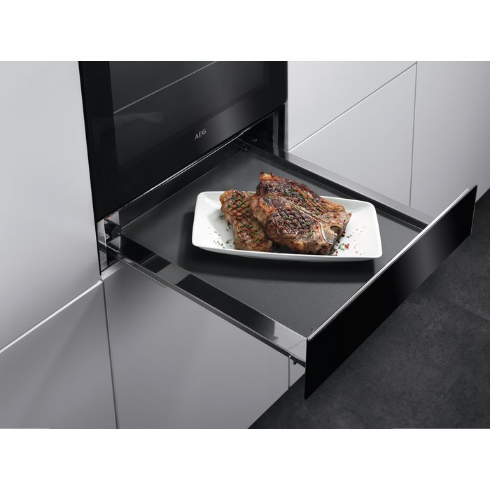 Cajón calientaplatos integrable de la Matt Black Collection de 14 cm con capacidad para 6 servicios, 30 ºC a 80 ºC, apertura «Push», negro mate