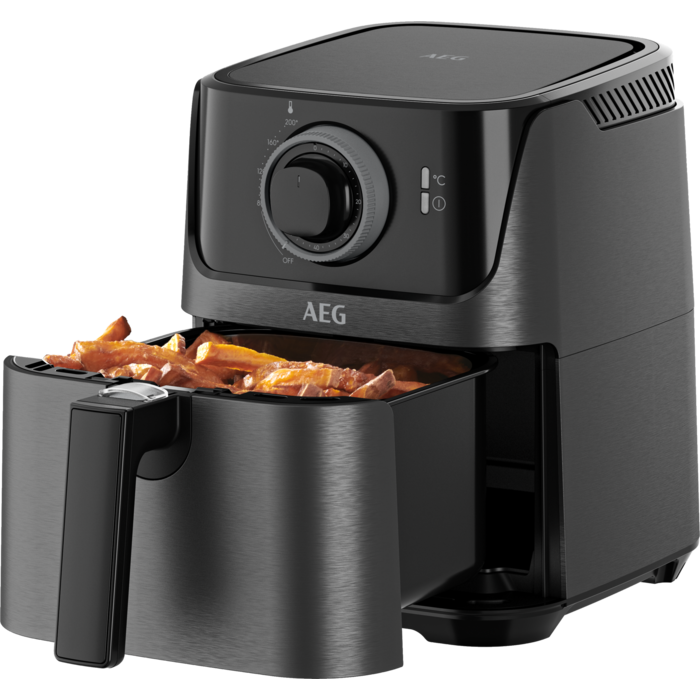 Freidora sin aceite Air Fryer de color negro granito con 2,5 litros de capacidad, temperatura máxima de 200 °C, bandeja lavable en lavavajillas, temporizador de 60 minutos, mando giratorio y mango ergonómico.