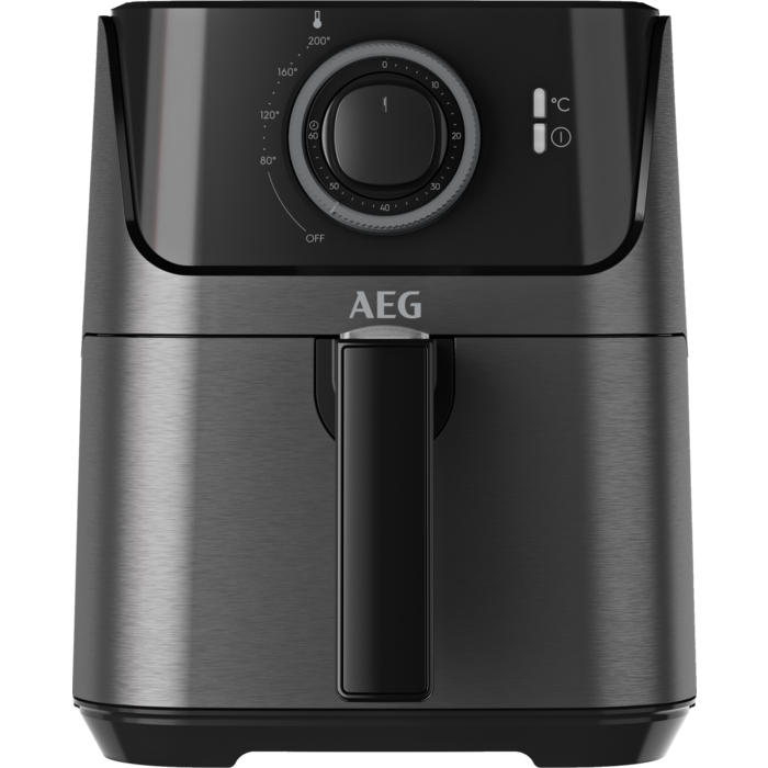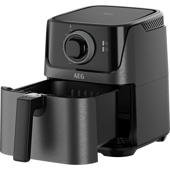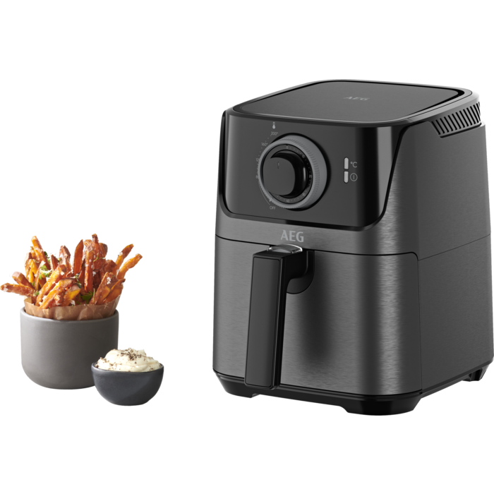 Freidora sin aceite Air Fryer de color negro granito con 2,5 litros de capacidad, temperatura máxima de 200 °C, bandeja lavable en lavavajillas, temporizador de 60 minutos, mando giratorio y mango ergonómico.