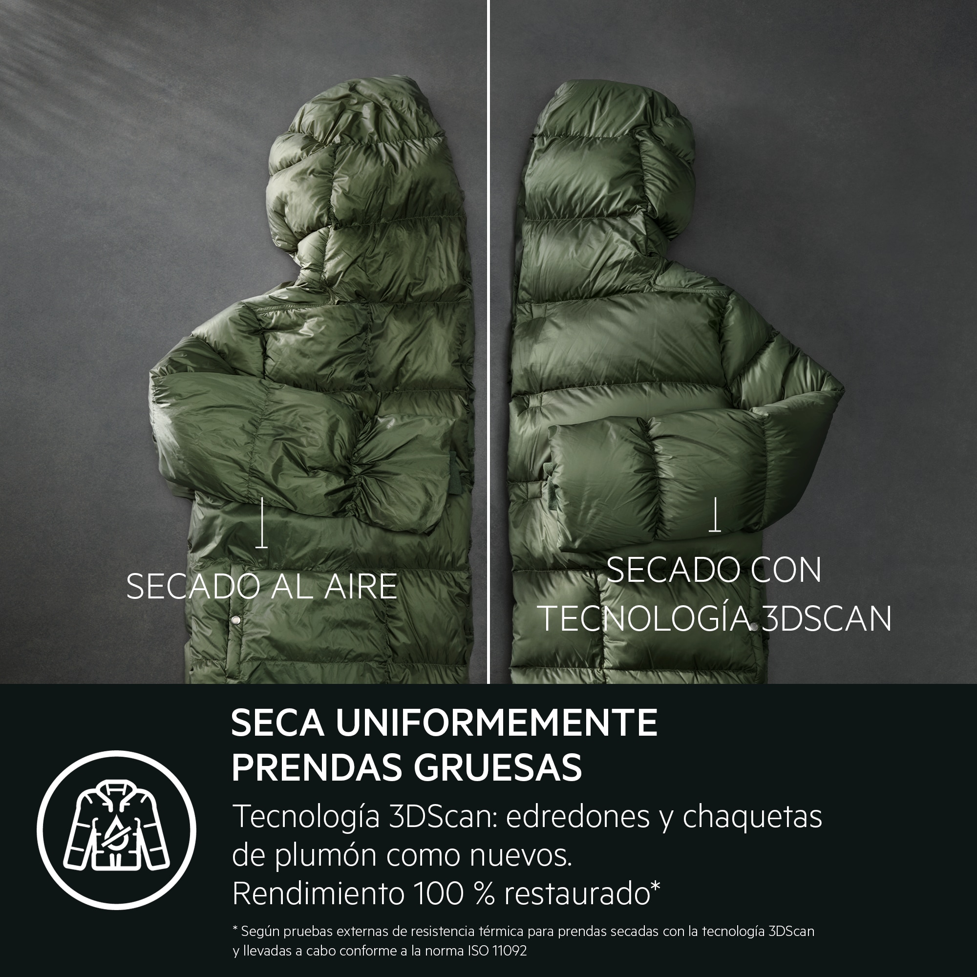* Basado en una prueba de resistencia térmica externa para prendas secadas con tecnología 3DScan, realizada según la norma ISO 11092.