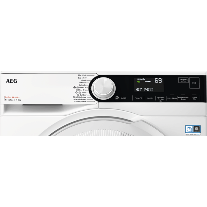 Lavadora de libre instalación Serie 7000 ProSteam® de 9.0 kg, tecnología ProSteam, PreciseWash, 1400 rpm, cajón largo, puerta blanca, panel blanco, motor Inverter, Certificado Woolmark Blue y Ariel Lenor, programa Higiene con vapor