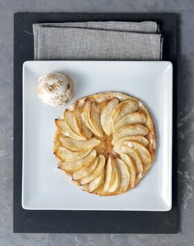 Sirve la tarta caliente con una bola de helado de caramelo.