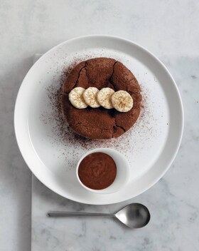 - Bate los huevos, las yemas de huevo y el azúcar hasta que tengan una textura ligera y esponjosa. Corta el plátano en rodajas de 1 cm y añádelas a la mezcla de huevo. Añade el chocolate negro derretido junto con la harina. Vierte la mezcla en moldes individuales untados con mantequilla.