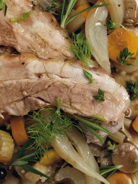 - Salpimentar la panceta por todas las caras y colocarla sobre el lecho de verduras y hierbas. Hornear la panceta en el nivel 2 del horno con el programa «Vapor combinado mitad» (Vapor al 50%), a una temperatura de 120 ºC, durante 3 horas.